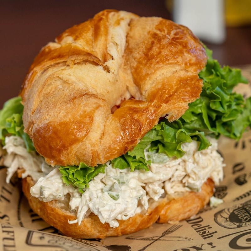 Homemade chicken salad, with lettuce and tomatoes on a buttered toasted croissant.
