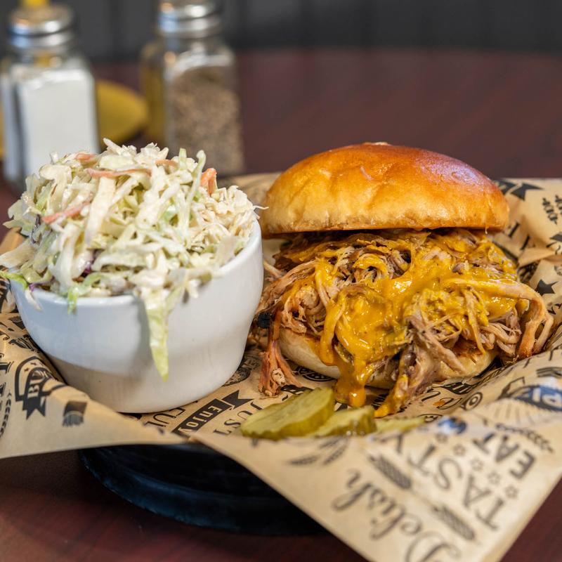 Smoked pulled pork topped with BBQ sauce, coleslaw, and pickles on a toasted bun.